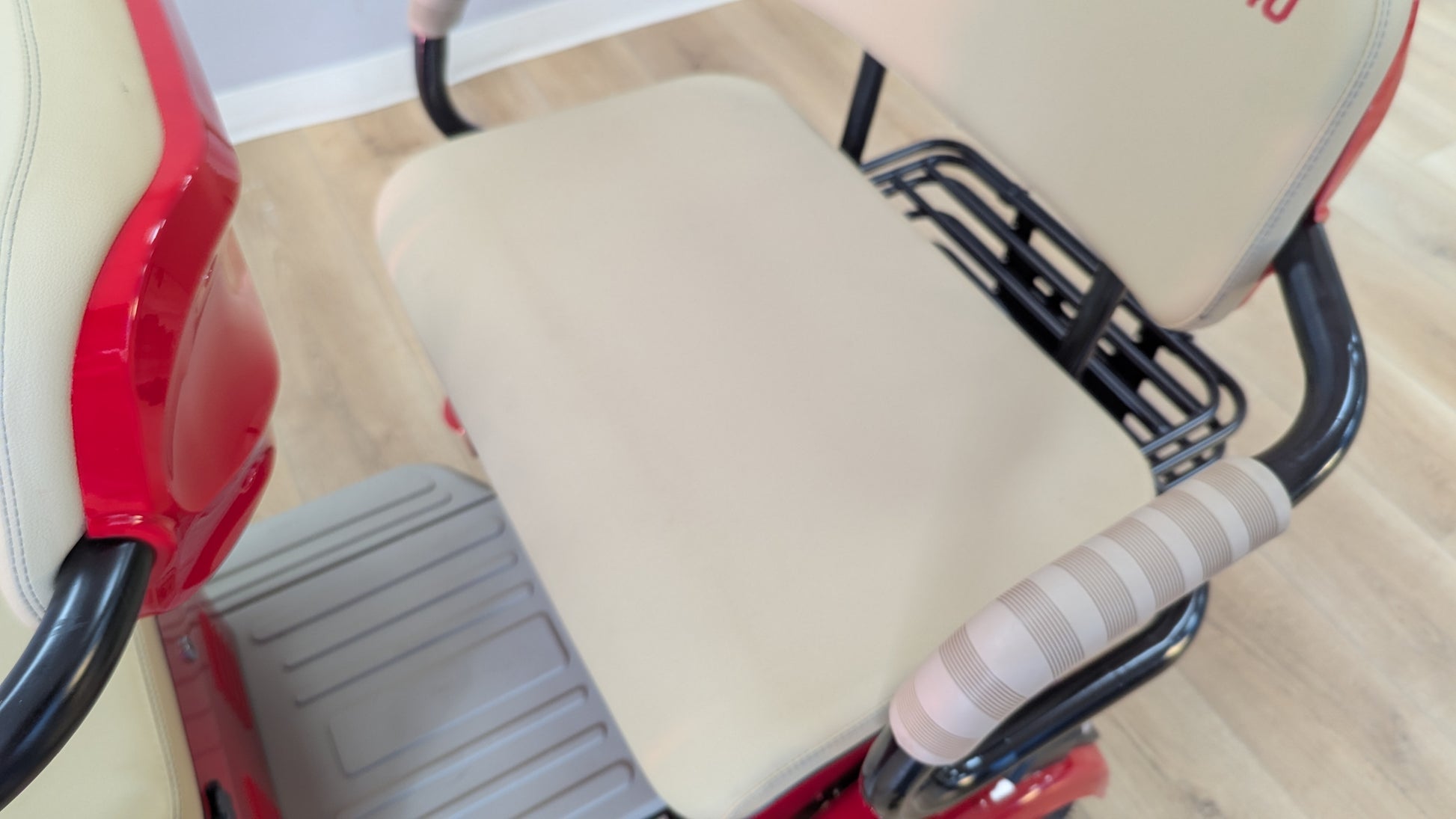 Seats 2 adults comfortably with padded seats and integrated handrails for support. -
